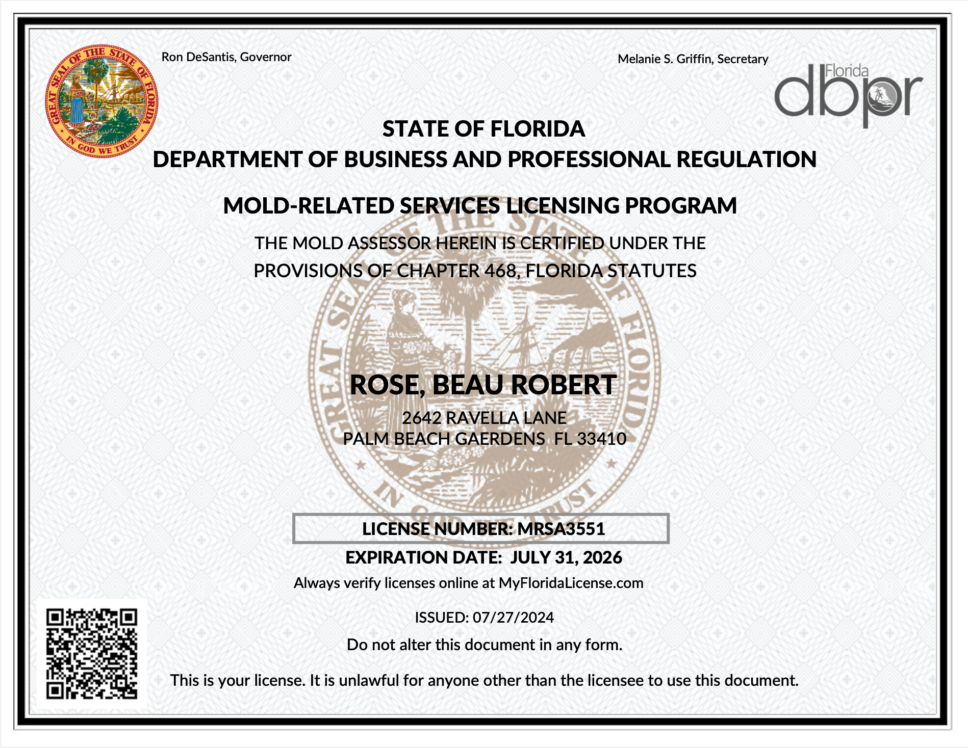 Mold Remediator - A qualified person, who has met Florida State Licensing requirements, that performs mold remediation.